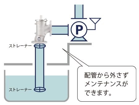 末端フート弁のメンテナンスには、吊り上げや水槽内の水を抜く等の手間が必要ですが、フートバルブは地上設置なので簡単に取り外しができます。