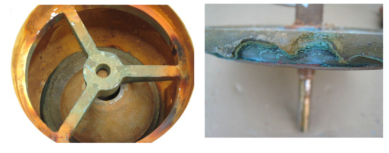 海水は3%程度の塩分を含むため電気を通しやすく、酸化還元反応による金属のイオン化を促進する性質をもちます。金属の表面がイオン化すると腐食が進み、弁体などの部品が損傷してしまいます。金属の種類によってイオン化傾向が高く腐食しやすいもの、しにくいものがありますが、株式会社イシザキのお客様事例では、海水を水槽に送るラインで使用していた青銅と黄銅(真鍮)材のバルブ内部に腐食が生じました。