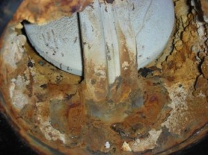 長期間にわたって開閉操作のないバルブ、例えば防火水槽の給水管末端に設置されたフートバルブ(フート弁)などでは、ボディや弁体、ヒンジ(蝶番)などに腐食(さび)が発生し固着することがあります。また、高粘度流体や粉体を扱う設備・ラインの場合、使用頻度が低いと残留物などが部品に付着しやすくなり、堆積して固着の原因となります。