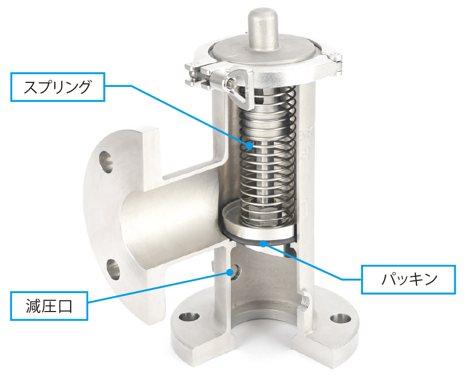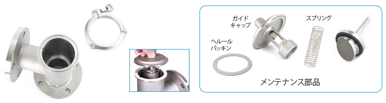 工具を使わずボルトを緩めるだけで着脱できるクランプを採用。アングル型でクランプを外せば弁体も簡単に取り外すことができ、メンテナンスが短時間で容易にできます。万一の落水でも、復旧作業が短時間、少人数ですみ、生産性を落としません。また、弁体をはじめパッキンやスプリングなどの各部品の交換も簡単です。金属部分はすべてステンレス製で部品の長寿命化を実現しているため、メンテナンスコストも削減できます。