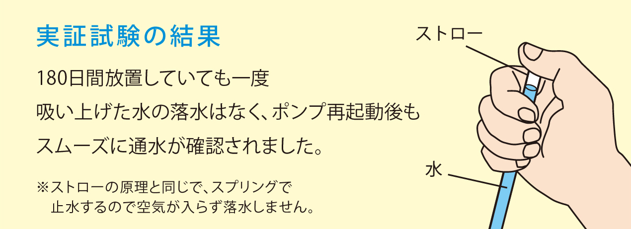 スプリングとパッキンでしっかり止水し、一度吸い上げると基本的に空気が入り込むことがないため、長期間にわたって落水しません。これは、液体を吸い込んだストローの上部を指で塞ぐと、液体が流れ落ちずにそのまま保持される現象と同じ原理に基づいています。液体で満たされた管内の気圧は大気圧よりも低いことから、大気圧に押されて液体が管内に留まるのです。落水の心配がなく、必要のない時はポンプを停止できるようになることで、水道代と電気代の大幅な削減も可能です。異物などが挟まると落水することもありますが、その際は図の減圧口から真空ポンプでバルブ一次側(吸い込み側)の空気を抜きながら吸い上げることで、簡単に復旧(呼び水)することができます。