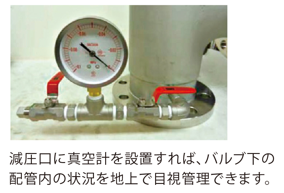 減圧口に真空計を設置すれば、バルブ一次側(吸い込み側)の配管内の状況を目視で確認、管理できます。